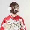 結び目を隠すように、水引や金箔を施したタイトな髪飾りを添えるのが旬。サイドの髪をツイスト(ねじり)や編み込みで立体的に仕上げると◎。
